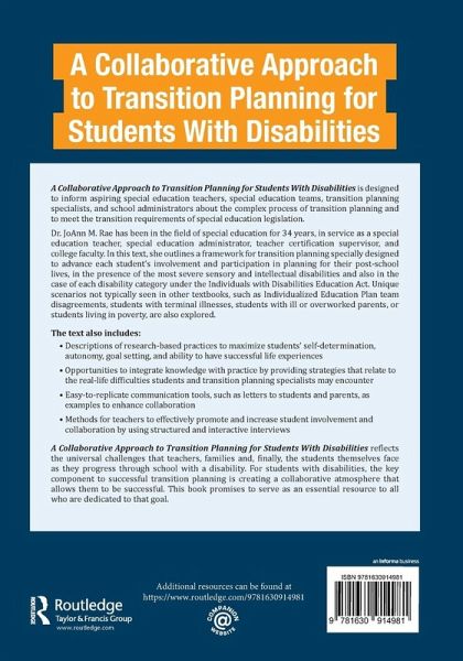A Collaborative Approach to Transition Planning for Students with Disabilities is designed to inform aspiring special education teachers and teams, transition planning specialists and school administrators about the complex process of transition planning and to meet the transition requirements of special education legislation.