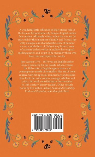 A wonderful little collection of short stories told in the form of fictional letters by famous English author Jane Austen. Although written when she was just 14 years old for the enjoyment of family and friends, her witty dialogue and characteristic sense of humour are very much there. This epistolary work showcases Austen's sharp humor and keen observations of human nature, providing a unique look at the social dynamics and romantic entanglements of her characters. A Collection of Letters is one of Austen's earliest works (it includes her original spelling quirks). Perfect for Austen enthusiasts, this collection highlights the budding talent of one of literature's most beloved authors. Jane Austen (1775 - 1817) was an English author known primarily for her novels, which critique the 18th century English upper classes and contemporary novels of sensibility. Her use of irony coupled with biting social commentary and realism have led to her wide acclaim amongst scholars and critics, her work contributing to the transition to 19th-century literary realism.