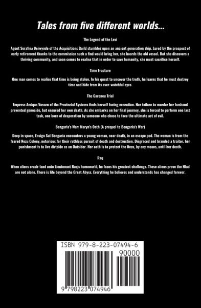 Tales from five different worlds… The Legend of the Levi: Agent Serafina Derwynde of the Acquisitions Guild stumbles upon an ancient generation ship. Lured by the prospect of early retirement thanks to the commission such a find would bring her, she boards the old vessel. But she discovers a thriving community, and soon comes to realise that in order to save humanity, she must sacrifice herself. Time Fracture: One man comes to realise that time is being stolen. In his quest to uncover the truth, he learns that he must destroy time and hide from its ever-watchful eyes. The Garoneu Trial: Empress Amiqus Vossen of the Provincial Systems finds herself facing execution. Her failure to murder her husband prevented genocide, but ensured her own death. As she embarks on her final journey, she is forced to perform one last task, one born of desperation by someone who chose to face the ultimate act of evil. Bengaria's War: Maryn's Oath (A prequel to Bengaria's War): Deep in space, Ensign Sul Bengaria encounters a young woman, near death, in an escape pod. The woman is from the feared Nezu Colony, notorious for their ruthless pursuit of death and destruction. Disgraced and branded a traitor, her punishment is to live dirtside as an Outsider. Her oath is to protect the Nezu, by any means, until her death. Raq: When aliens crash-land onto Lieutenant Raq's homeworld, he faces his greatest challenge. These aliens prove the Hlad are not alone. There is life beyond the Great Abyss. Everything he believes and understands has changed forever.