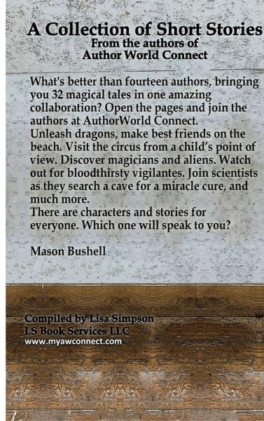 What's better than fourteen authors bringing you 32 magical tales, all in one amazing collaboration? Open these pages and join the authors from AuthorWorld Connect. Unleash dragons, take a walk along the beach with a best friend. Visit a lone circus from a child's point of view. Discover magicians and aliens, watch out for blood-thirsty vigilantes, Join scientists as they search a cave for a miracle cure, and much more. There are stories for everyone. Which one will speak to you?