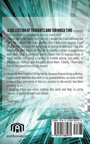A Collection of Thoughts and Too Much Time is simply that: a collection of thoughts and too much time! I would like to be clever, but I am not. I would like to be talented, but I am not. I would like to be wealthy, but it will never happen. I just simply exist in much the same way as everyone else and I see and experience what others do. Yet life is simply a series of snapshots, with each 'snap' a particular event. I have tried to capture some of these events, not using a camera or mobile phone, but rather, to express my feelings and thoughts about them. Clearly, I have also had far too much time on my hands! I dedicate this collection to my family, because they are long suffering. I particularly dedicate this work to my grandchildren, as some of this is about them and some of this is a reaction to the world I see them growing up in. I sincerely hope you enjoy reading this work and that, in some manner, it sparks thought and debate. Thank you,