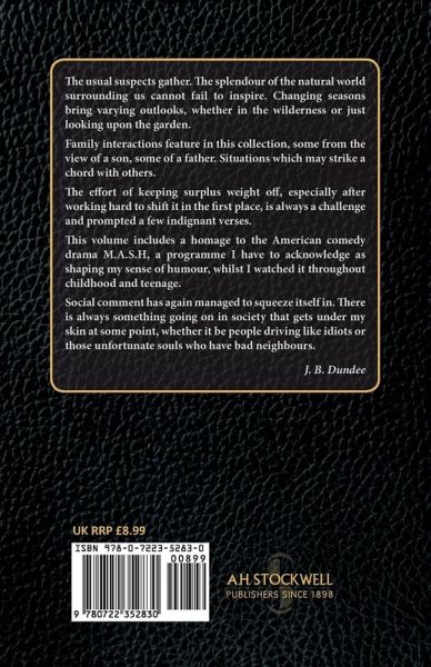 The usual suspects gather. The splendour of the natural world surrounding it cannot fail to inspire. Changing seasons bring varying outlooks. Whether in the wilderness or just looking upon the garden. Family interactions feature in this collection, some from the view of a son, some of a father. Situations which may strike a chord with others. The effort of keeping surplus weight off, especially after working hard to shift it, in the first place is always a challenge and prompted a few indifferent verses. This volume includes a homage to the American comedy drama M.A.S.H, a programme I have to acknowledge as shaping my sense of humour, whilst I watched it throughout childhood and teenage. Social comment has again managed to squeeze itself in. There is always something going on in society that gets under my skin at some point, whether it be people driving like idiots or those unfortunate souls who have bad neighbours. J. B. Dundee