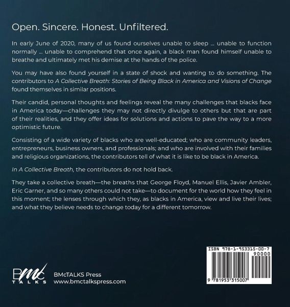Open. Sincere. Honest. Unfiltered. In early June of 2020, many of us found ourselves unable to sleep ... unable to function normally ... unable to comprehend that once again, a black man found himself unable to breathe and ultimately met his demise at the hands of the police. You may have also found yourself in a state of shock and wanting to do something. The contributors to A Collective Breath: Stories of Being Black in America and Visions of Change found themselves in similar positions. Their candid, personal thoughts and feelings reveal the many challenges that blacks face in America today-challenges they may not directly divulge to others but that are part of their realities, and they offer ideas for solutions and actions to pave the way to a more optimistic future. Consisting of a wide variety of blacks who are well-educated; who are community leaders, entrepreneurs, business owners, and professionals; and who are involved with their families and religious organizations, the contributors tell of what it is like to be black in America. In A Collective Breath, the contributors do not hold back. They take a collective breath -- the breaths that George Floyd, Manuel Ellis, Javier Ambler, Eric Garner, and so many others could not take -- to document for the world how they feel in this moment; the lenses through which they, as blacks in America, view and live their lives; and what they believe needs to change today for a different tomorrow.