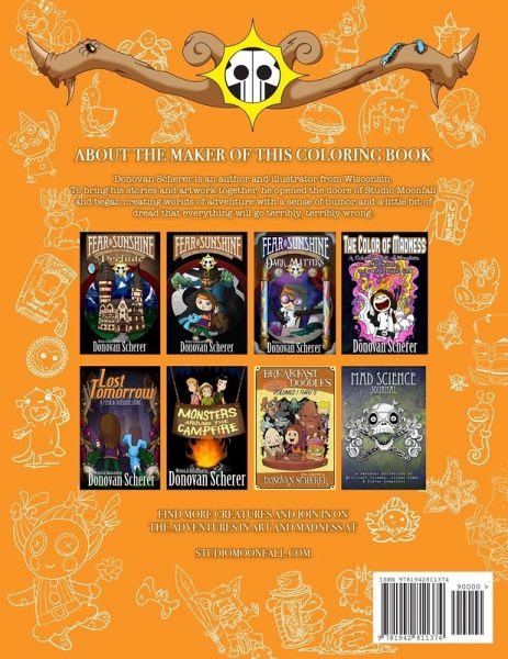 This all-ages coloring book was made from the Weird Ideas of a bunch of strange people submitting an adjective, noun, and verb... or something along those lines. Here's what we pulled out of their heads: ¿ Fat Jackalope Hopping ¿ Sticky Alien Running ¿ Creepy Doll Skipping ¿ Crazy Demogorgon Dancing ¿ Panicked Author Cheese-Hording ¿ Piggybacking Lincoln Running ¿ Scary T-Rex Singing ¿ Vicious Great Dane Flying ¿ Tall Pig Dancing ¿ Overdressed Otter Ordering Takeout ¿ Festive ZomBean Hatching ¿ Gleeful Elf Bowling ¿ Funny Frog Eating French Fries ¿ Joyful Hippo Flying ¿ Middle-Aged Lady Karen-ing ¿ Hippie Margarita Skateboarding ¿ Frantic Flamingo Fishing ¿ Misunderstood Sea Slug Dancing ¿ Geeky Goat Unicycling ¿ Lazy Lady Lounging ¿ Sad Dog Crying ¿ Gassy Unicorn Flying ¿ Hungry Zombie Eating ¿ Evil Cats Battling ¿ Hairy Werewolf Shaving ¿ Skinny Cat Drinking ¿ Angry Venus Fly Trap Vacuuming ¿ Eccentric Goats Golfing ¿ Bespectacled Pharmacist Quarantining ¿ Magical Clown Dancing ¿ Enormous Tree Monster Rampaging ¿ Ticklish Luchador Shaving ¿ Sexy Chocolate Milk Dancing ¿ Funky Platypus Selling ¿ Musical Troll Serenading Mud Zombies ¿ Carnivorous Lawnmower Partying ¿ Fierce Golem Fighting ¿ Hangry Skunk Gang Attacking ¿ Broken Robot Composting ¿ Human-Legged Duck Marathoning ¿ Shy Dinosaur Building Birdhouses ¿ Flipped Out Chickens Trampolining ¿ Happy Graboid Tunneling ¿ Suspicious Cereal Killing ¿ Odd Duck Waiting ¿ Adorable Puppy Playing With Hot Dogs ¿ Zebra-Feathered Raven Shooting Archery ¿ Winged Hippo Ballet Dancing Illustrated by Donovan Scherer, author of the middle-grade fantasy adventure series Fear & Sunshine, A Coloring Book of Weird Ideas brings together 48 new illustrations for your coloring fun.