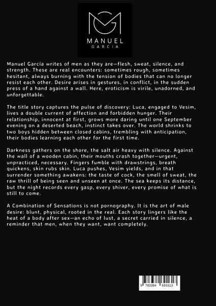 Manuel García writes of men as they are-flesh, sweat, silence, and strength. These are real encounters: sometimes rough, sometimes hesitant, always burning with the tension of bodies that can no longer resist each other. Desire arises in gestures, in conflict, in the sudden press of a hand against a wall. Here, eroticism is virile, unadorned, and unforgettable.The title story captures the pulse of discovery: Luca, engaged to Vesim, lives a double current of affection and forbidden hunger. Their relationship, innocent at first, grows more daring until one September evening on a deserted beach, instinct takes over. The world shrinks to two boys hidden between closed cabins, trembling with anticipation, their bodies learning each other for the first time.Darkness gathers on the shore, the salt air heavy with silence. Against the wall of a wooden cabin, their mouths crash together-urgent, unpracticed, necessary. Fingers fumble with drawstrings, breath quickens, skin rubs skin. Luca pushes, Vesim yields, and in that surrender something awakens: the taste of cock, the smell of sweat, the raw thrill of being seen and unseen at once. The sea keeps its distance, but the night records every gasp, every shiver, every promise of what is still to come.A Combination of Sensations is not pornography. It is the art of male desire: blunt, physical, rooted in the real. Each story lingers like the heat of a body after sex-an echo of lust, a secret carried in silence, a reminder that men, when they want, want completely.