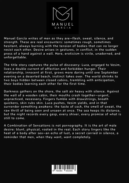 Manuel García writes of men as they are-flesh, sweat, silence, and strength. These are real encounters: sometimes rough, sometimes hesitant, always burning with the tension of bodies that can no longer resist each other. Desire arises in gestures, in conflict, in the sudden press of a hand against a wall. Here, eroticism is virile, unadorned, and unforgettable.The title story captures the pulse of discovery: Luca, engaged to Vesim, lives a double current of affection and forbidden hunger. Their relationship, innocent at first, grows more daring until one September evening on a deserted beach, instinct takes over. The world shrinks to two boys hidden between closed cabins, trembling with anticipation, their bodies learning each other for the first time.Darkness gathers on the shore, the salt air heavy with silence. Against the wall of a wooden cabin, their mouths crash together-urgent, unpracticed, necessary. Fingers fumble with drawstrings, breath quickens, skin rubs skin. Luca pushes, Vesim yields, and in that surrender something awakens: the taste of cock, the smell of sweat, the raw thrill of being seen and unseen at once. The sea keeps its distance, but the night records every gasp, every shiver, every promise of what is still to come.A Combination of Sensations is not pornography. It is the art of male desire: blunt, physical, rooted in the real. Each story lingers like the heat of a body after sex-an echo of lust, a secret carried in silence, a reminder that men, when they want, want completely.
