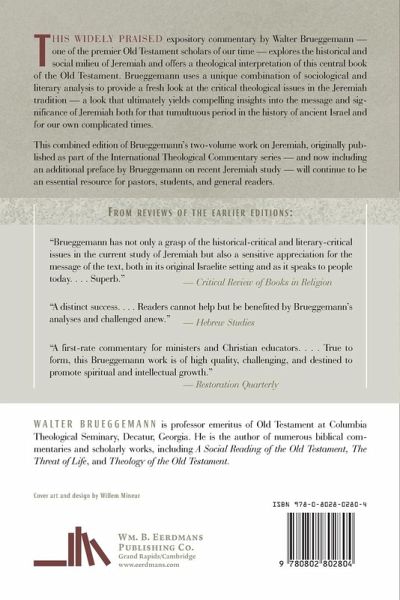 Jeremiah's poignant lament over Judah's social and religious disintegration reflects God's own pathos-laden yearning for his disobedient covenant people. In this widely praised expository commentary Walter Brueggemann, one of the premier Old Testament scholars of our time, explores the historical setting and message of Jeremiah as well as the text's relevance for the church today. Offering a fresh look at the critical theological issues in the Jeremiah tradition, Brueggemann argues that Jeremiah's voice compels us to rediscern our own situation, issuing an urgent invitation to faith, obedience, justice, and compassion. This combined edition of Brueggemann's original two-volume work, published until recently as part of the International Theological Commentary series, is an essential resource for students, pastors, and general readers alike. It is reprinted here with a new introduction by Brueggemann that surveys the current state of Jeremiah studies.