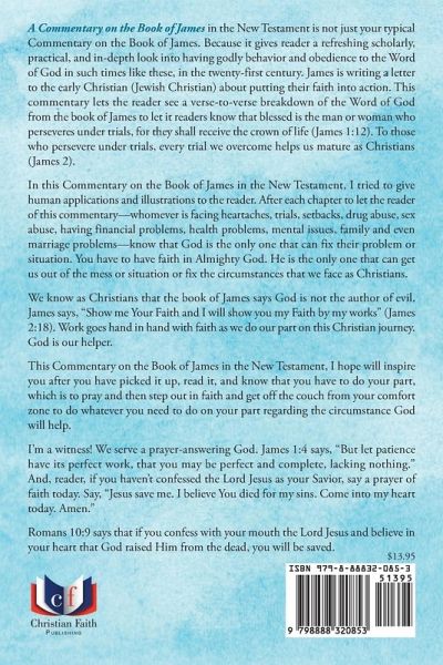 A Commentary on the Book of James in the New Testament is not just your typical Commentary on the Book of James. Because it gives reader a refreshing scholarly, practical, and in-depth look into having godly behavior and obedience to the Word of God in such times like these, in the twenty-first century. James is writing a letter to the early Christian (Jewish Christian) about putting their faith into action. This commentary lets the reader see a verse-to-verse breakdown of the Word of God from the book of James to let it readers know that blessed is the man or woman who perseveres under trials, for they shall receive the crown of life (James 1:12). To those who persevere under trials, every trial we overcome helps us mature as Christians (James 2). In this Commentary on the Book of James in the New Testament, I tried to give human applications and illustrations to the reader. After each chapter to let the reader of this commentary--whomever is facing heartaches, trials, setbacks, drug abuse, sex abuse, having financial problems, health problems, mental issues, family and even marriage problems--know that God is the only one that can fix their problem or situation. You have to have faith in Almighty God. He is the only one that can get us out of the mess or situation or fix the circumstances that we face as Christians. We know as Christians that the book of James says God is not the author of evil. James says, "Show me Your Faith and I will show you my Faith by my works" (James 2:18). Work goes hand in hand with faith as we do our part on this Christian journey. God is our helper. This Commentary on the Book of James in the New Testament, I hope will inspire you after you have picked it up, read it, and know that you have to do your part, which is to pray and then step out in faith and get off the couch from your comfort zone to do whatever you need to do on your part regarding the circumstance God will help. I'm a witness! We serve a prayer-answering God. James 1:4 says, "But let patience have its perfect work, that you may be perfect and complete, lacking nothing." And, reader, if you haven't confessed the Lord Jesus as your Savior, say a prayer of faith today. Say, "Jesus save me. I believe You died for my sins. Come into my heart today. Amen." Romans 10:9 says that if you confess with your mouth the Lord Jesus and believe in your heart that God raised Him from the dead, you will be saved.