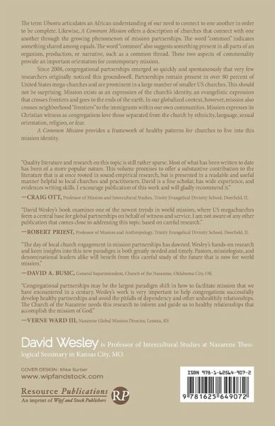 The term Ubuntu articulates an African understanding of our need to connect to one another in order to be complete. Likewise, A Common Mission offers a description of churches that connect with one another through the growing phenomenon of mission partnerships. The word ""common"" indicates something shared among equals. The word ""common"" also suggests something present in all parts of an organism, production, or narrative, such as a common thread. These two aspects of commonality provide an important orientation for contemporary mission. Since 2008, congregational partnerships emerged so quickly and spontaneously that very few researchers originally noticed this groundswell. Partnerships remain present in over 80 percent of United States mega-churches and are prominent in a large number of smaller US churches. This should not be surprising. Mission exists as an expression of the church's identity, an evangelistic expression that crosses frontiers and goes to the ends of the earth. In our globalized context, however, mission also crosses neighborhood ""frontiers"" to the immigrants within our own communities. Mission expresses its Christian witness as congregations love those separated from the church by ethnicity, language, sexual orientation, religion, or fear. A Common Mission provides a framework of healthy patterns for churches to live into this mission identity. ""Quality literature and research on this topic is still rather sparse. Most of what has been written to date has been of a more popular nature. This volume promises to offer a substantive contribution to the literature that is at once rooted in sound empirical research, but is presented in a readable and useful manner, helpful to local churches and practitioners. David is a fine scholar, has wide experience, and evidences writing skills. I encourage publication of this work and will gladly recommend it."" --Craig Ott, Professor of Mission and Intercultural Studies, Trinity Evangelical Divinity School, Deerfield, IL ""David Wesley's book examines one of the newest trends in world mission, where US megachurches form a central base for global partnerships on behalf of witness and service. I am not aware of any other publication that comes close to addressing this topic based on careful research."" --Robert Priest, Professor of Mission and Anthropology, Trinity Evangelical Divinity School, Deerfield, IL ""The day of local church engagement in mission partnerships has dawned. Wesley's hands-on research and keen insights into this new paradigm is both greatly needed and timely. Pastors, missiologists, and denominational leaders alike will benefit from this careful study of the future that is now for world mission."" --David A. Busic, General Superintendent, Church of the Nazarene, Oklahoma City, OK ""Congregational partnerships may be the largest paradigm shift in how to facilitate mission that we have encountered in a century. Wesley's work is very important to help congregations successfully develop healthy partnerships and avoid the pitfalls of dependency and other unhealthily relationships. The Church of the Nazarene needs this research to inform and guide us to healthy relationships that accomplish the mission of God."" --Verne Ward III, Nazarene Global Mission Director, Lenexa, KS David Wesley is Professor of Intercultural Studies at Nazarene Theological Seminary in Kansas City, MO.