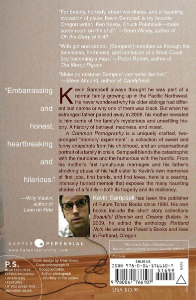 In 2003 Kevin Sampsell authored a chapbook memoir of the same title. It was written as a kind of "memory experiment," in which he recollected luminous details from his childhood in independently amusing chapters. It functioned as an experiential catalogue of American youth in the 70s and 80s. In 2008 Kevin¿s estranged father died of an aneurysm. When he returned home to Kennewick, Washington for the funeral, Kevin¿s mother revealed to him disturbing threads in their family history -- stories of incest, madness, betrayal, and death -- which retroactively colored Kevin¿s memories of his upbringing and youth. He learned of his mother¿s first two husbands, the fathers of his three older, mythologized half-siblings, and the havoc they wreaked on his mother. He learned of his own father¿s seething resentment of his step-children, which was expressed in physical, pyschological, and sexual abuse. And he learned more about his oldest step-sister, Elinda, who, as a young girl, was labeled "feebleminded" by a teacher. When she became a teenager, she was sent to a psychiatric hospital. She entered the clinic at 98 pounds. She left two years later 200 pounds, diabetic, having endured numerous shock treatments. Then, after finally returning home, she was made pregnant by Kevin¿s father. Only at the end of the book do we learn what chance in life a person like this has. While his family¿s story provides the framework of the book, what¿s left in between is Kevin¿s story of growing up in the Pacific Northwest. He tells of his first jobs, first bands, first loves, and one worn, teal blue suitcase filled with the choicest porn in all of Kennewick, Washington. Employing the same form of memoir as he did in his previous book, Kevin intertwines the tragic with the everyday, the dysfunctional with the fun, lending A COMMON PORNOGRAPHY its undeniable, unsensationalized reality. The elastic conceit of his "memory experiment" captures the many shades and the whole of the Sampsell family -- both its tragedy and its resiliency. Kevin relates this history in a charming, honest, insightful, and funny voice.