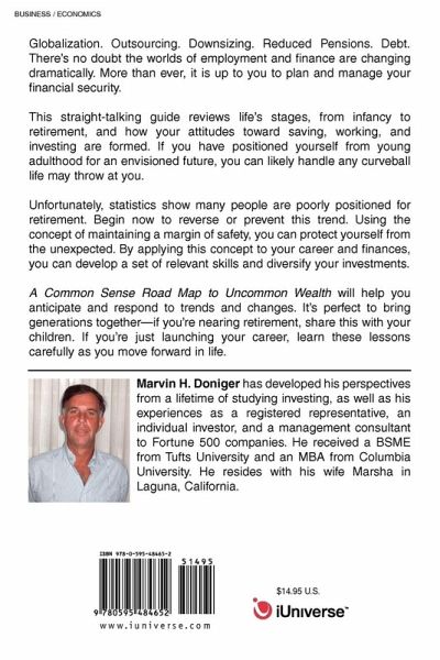 Globalization. Outsourcing. Downsizing. Reduced Pensions. Debt. There's no doubt the worlds of employment and finance are changing dramatically. More than ever, it is up to you to plan and manage your financial security. This straight-talking guide reviews life's stages, from infancy to retirement, and how your attitudes toward saving, working, and investing are formed. If you have positioned yourself from young adulthood for an envisioned future, you can likely handle any curveball life may throw at you. Unfortunately, statistics show many people are poorly positioned for retirement. Begin now to reverse or prevent this trend. Using the concept of maintaining a margin of safety, you can protect yourself from the unexpected. By applying this concept to your career and finances, you can develop a set of relevant skills and diversify your investments. A Common Sense Road Map to Uncommon Wealth will help you anticipate and respond to trends and changes. It's perfect to bring generations together-if you're nearing retirement, share this with your children. If you're just launching your career, learn these lessons carefully as you move forward in life.