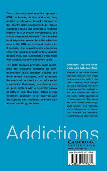 The community reinforcement approach (CRA) to treating alcohol and other drug problems is designed to make changes in the client's daily environment, to reduce substance abuse and promote a healthier lifestyle. It is of proven effectiveness, and should be more widely used. This 2001 book presents research on the effectiveness of the CRA for a clinical readership. It includes the original study comparing CRA with traditional treatments of alcohol dependence, and summarizes other trials with alcohol, cocaine and heroin users. The CRA program provides basic guidelines for clinicians, focusing on communication skills, problem-solving and drink-refusal strategies, and addresses the needs of the client as part of a social community. Combining practical advice on such matters with a scientific survey of CRA in use, this book offers a treatment approach to all involved with the support and treatment of those with alcohol and drug problems.