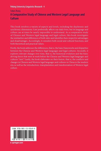 This book involves a variety of aspects and levels, including the diachronic and synchronic dimensions. Law profoundly affects our daily lives, but its language and culture can at times be nearly impossible to understand. As a comparative study of Chinese and Western legal language and legal culture, this book investigates the similarities and differences of both sides and identifies their respective advantages and disadvantages. Accordingly, it considers both social and cultural functions, and both theoretical and practical values. Firstly, the book addresses the differences, that is, the…mehr