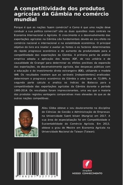 Porque é que as nações fazem comércio? e Como é que uma nação deve conduzir a sua política comercial? são as duas questões mais centrais na Economia Internacional e Agrícola. O crescimento e o desenvolvimento das exportações agrícolas na Gâmbia são fundamentais devido ao seu efeito no comércio nacional e internacional e na estabilidade económica. O principal objetivo do livro era revelar e avaliar as fontes e os factores determinantes do rápido progresso económico e do aumento da produtividade para a competitividade das exportações da Gâmbia. A primeira parte da análise empírica adopta a aplicação dos testes ADF, de raiz unitária e de causalidade de Granger para determinar os efeitos positivos da expansão das exportações, do desenvolvimento agrícola, das despesas públicas com a educação e do investimento direto estrangeiro (IDE), utilizando o modelo VAR. Os resultados revelam que as variáveis [independentes] analisadas determinam o progresso económico da Gâmbia a uma taxa de 72,09%. A segunda parte calcula e analisa os índices de Balassa para a competitividade das exportações agrícolas da Gâmbia durante o período 1995-2014. Os resultados foram impressionantes, uma vez que a maioria dos produtos registou vantagens comparativas mais elevadas do que as de outras nações competitivas.