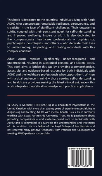 This book is dedicated to the countless individuals living with Adult ADHD who demonstrate remarkable resilience, perseverance, and creativity in the face of significant challenges. Their unwavering spirits, coupled with their persistent quest for self-understanding and improved wellbeing, inspire us all. It is also dedicated to the compassionate healthcare professionals - psychiatrists, psychologists, neurologists, and others - who dedicate their lives to understanding, supporting, and treating individuals with this complex condition. Adult ADHD remains significantly under-recognized and undertreated, resulting in substantial personal and societal costs. This book aims to bridge this gap by providing a comprehensive, accessible, and evidence-based resource for both individuals with ADHD and the healthcare professionals who support them. Written with a dual audience in mind - those seeking self-understanding and healthcare providers seeking the latest clinical guidance - this work integrates theoretical knowledge with practical applications.