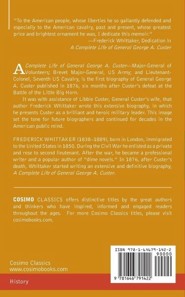 ------------------------------------------------------------------------------------------------------------------------------- "To the American people, whose liberties he so gallantly defended and especially to the American cavalry, past and present, whose greatest price and brightest ornament he was, I dedicate this memoir." -Frederick Whittaker, Dedication in A Complete Life of General George A. Custer A Complete Life of General George A. Custer-Major-General of Volunteers; Brevet Major-General, US Army; and Lieutenant-Colonel, Seventh US Cavalry, is the first biography of General George A. Custer published in 1876, six months after Custer's defeat at the Battle of the Little Big Horn. It was with assistance of Libbie Custer, General Custer's wife, that author Frederick Whittaker wrote this extensive biography, in which he presents Custer as a brilliant and heroic military leader. This image set the tone for future biographers and continued for decades in the American public mind.