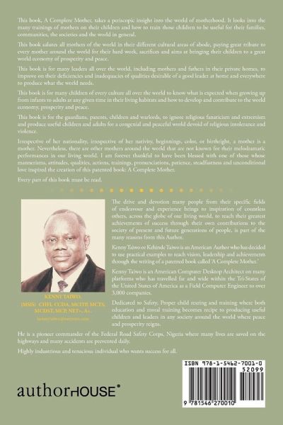 This book, A Complete Mother, takes a periscopic insight into the world of motherhood. It looks into the many trainings of mothers on their children and how to train those children to be useful for their families, communities, the societies and the world in general. This book salutes all mothers of the world in their different cultural areas of abode, paying great tribute to every mother around the world for their hard work, sacrifices and aims at bringing their children to a great world economy of prosperity and peace. This book is for many leaders all over the world, including mothers and fathers in their private homes, to improve on their deficiencies and inadequacies of qualities desirable of a good leader at home and everywhere to produce what the world needs. This book is for many children of every culture all over the world to know what is expected when growing up from infants to adults at any given time in their living habitats and how to develop and contribute to the world economy, prosperity and peace. This book is for the guardians, parents, children and warlords, to ignore religious fanaticism and extremism and produce useful children and adults for a congenial and peaceful world devoid of religious intolerance and violence. Irrespective of her nationality, irrespective of her nativity, beginnings, color, or birthright, a mother is a mother. Nevertheless, there are other mothers around the world that are not known for their melodramatic performances in our living world. I am forever thankful to have been blessed with one of those whose mannerisms, attitudes, qualities, actions, trainings, pronunciations, patience, steadfastness and unconditional love inspired the creation of this patented book: A Complete Mother. Every part of this book must be read.