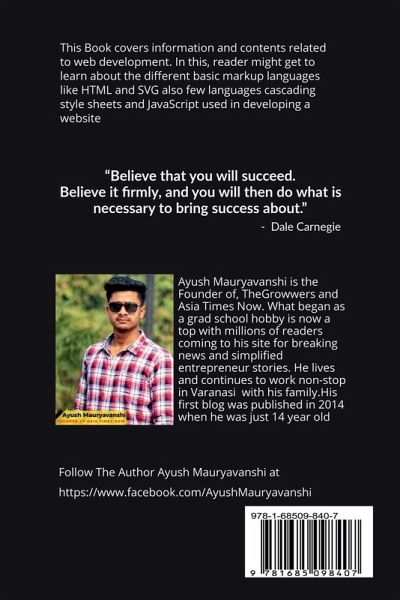 This Book covers information and contents related to web development. In this, reader might get to learn about the different basic markup languages like HTML and SVG also few languages cascading style sheets and JavaScript used in developing a website. This E- book also covers some information regarding: SEO which helps in optimizing your website to make it more visible when people use Google, Bing, or other search engines to look for goods or services relevant to your organization. Machine learning where you would learn how the machine works and where is the artificial intelligence used. At last on conclusion part, we have added few important questions where the reader can examine themselves how much they learned from this Book.