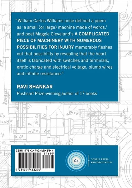 Early Praise for A Complicated Piece of Machinery with Numerous Possibilities for Injury "William Carlos Williams once defined a poem as 'a small (or large) machine made of words,' and poet Maggie Cleveland's A Complicated Piece of Machinery with Numerous Possibilities for Injury memorably fleshes out that possibility by revealing that the heart itself is fabricated with switches and terminals, erotic charge and electrical voltage, plumb wires and infinite resistance. Separated into five sections-or floors-this book rises from an intimate look at the mechanics of elevators up through a series of compelling erasures of a public document on manufacturing accidents and finally onto the rooftop of a long poem that channels Charles Olson or Rachel Blau DuPlessis but that remains utterly distinctive in its evocation of an external and internal landscape perpetually decaying in time, where memory is a 'rough rope net' and our waters are 'almost safe for swimming.' Simultaneously canny with warning, structurally ambitious and deeply personal yet universal, Cleveland captures the scale, the tumult, the thrill and the quiet of contemporary life in a remarkable first book of poems." Ravi Shankar Pushcart Prize-winning author of 17 books "This inimitable book asks: How can we live organically in a world that seems to be falling apart? The speaker of these poems is challenged not only by personal history, but also by the physical environment in which this history takes place and challenges this personal history. Disasters, both natural and manmade, create a world on the precipice. This world out of balance is created vividly on the page. But more: this world is created with an energy that borders between destruction and resurrection, between chaos and joy. The book ultimately asks us to comb through our individual lives and the lives of the things, both animate and inanimate, that surround us. A Complicated Piece of Machinery with Numerous Possibilities for Injury introduces us to a poet who is, in a word, necessary." Kenny Fries Award-winning author of In the Province of the Gods and In the Gardens of Japan "With a quiet wryness and quickening around what makes life electric, these poems are Maggie Cleveland's heirlooms. Whether through environs of the inner workings of elevators, landscape of Laurentide ice, or combusted relationships-that lost Victorian Prostitute Couch-whether in a series of erasures or wide-cast net of the book's final achievement, its long sequence centering a span of cosmic in cellular connections, the sensibility is always transporting and wise, her perambulations of mind admirably able to handle the understated as well as oracular. I particularly feel the way they 'take the weight of the loss and cast it against// what's left,' providing much care to notice." Douglas A. Martin