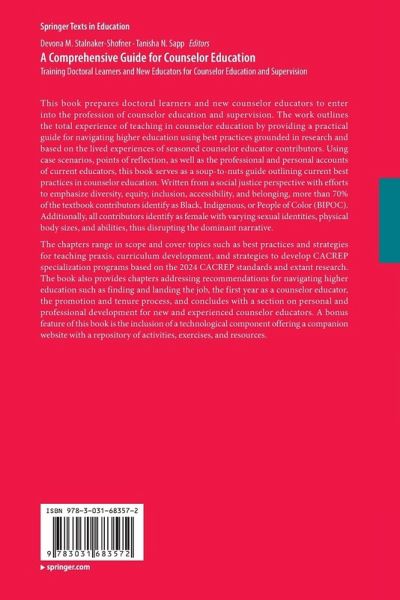 PartI: Teaching, Supervision, and Counseling Curriculum.- Diversity, Equity, Inclusion, Belonging, Accessibility, and Social Justice in Counselor Education.- Common Teaching Strategies.- Best Practices for Online Education.- Clinical Supervision within the Degree Program.- Course Development.- PartII: Working with Counselors in Training.- Strategies for Recruitment, Admission, and Retention.- Faculty Advisement.- Remediation and Gatekeeping.-PartIII: Navigating Higher Education.- Common Pitfalls for New Counselor Educators and How to Prevent Them.- Finding and Landing the Job.- The First Year.- The International Learner and Counselor Educator.- Counselors-in-Training and Counselor Educators with Disabilities.- The Promotion and Tenure Process.- PartIV: Counseling Specializations.- Understanding the CACREP Standards and Self-Study Process.- Addiction Counseling.- Career Counseling.- Clinical Mental Health Counseling.- Clinical Rehabilitation and Rehabilitation Counseling.- College Counseling and Student Affairs.- Marriage, Couple, and Family Counseling.- School Counseling.- PartV: Personal and Professional Development.- Leadership and Administrative Roles in Counselor Education.- Maintaining and Promoting Wellness for Faculty and Counselors-in-Training.- Imposter Phenomenon - Recognizing, Managing, and Preventing.