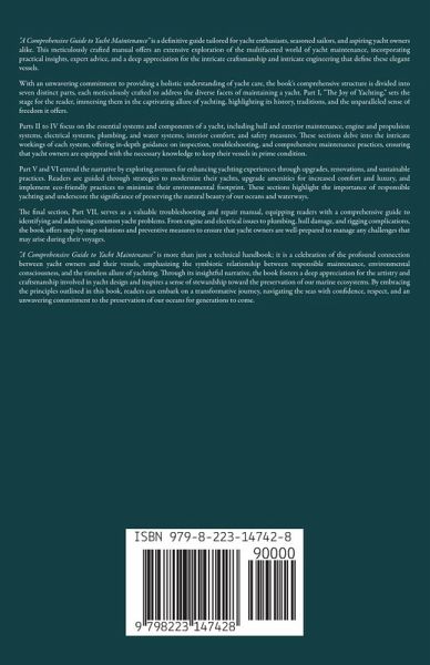 "A Comprehensive Guide to Yacht Maintenance" is a definitive guide tailored for yacht enthusiasts, seasoned sailors, and aspiring yacht owners alike. This meticulously crafted manual offers an extensive exploration of the multifaceted world of yacht maintenance, incorporating practical insights, expert advice, and a deep appreciation for the intricate craftsmanship and intricate engineering that define these elegant vessels. With an unwavering commitment to providing a holistic understanding of yacht care, the book's comprehensive structure is divided into seven distinct parts, each meticulously crafted to address the diverse facets of maintaining a yacht. Part I, "The Joy of Yachting," sets the stage for the reader, immersing them in the captivating allure of yachting, highlighting its history, traditions, and the unparalleled sense of freedom it offers. Parts II to IV focus on the essential systems and components of a yacht, including hull and exterior maintenance, engine and propulsion systems, electrical systems, plumbing, and water systems, interior comfort, and safety measures. These sections delve into the intricate workings of each system, offering in-depth guidance on inspection, troubleshooting, and comprehensive maintenance practices, ensuring that yacht owners are equipped with the necessary knowledge to keep their vessels in prime condition. Part V and VI extend the narrative by exploring avenues for enhancing yachting experiences through upgrades, renovations, and sustainable practices. Readers are guided through strategies to modernize their yachts, upgrade amenities for increased comfort and luxury, and implement eco-friendly practices to minimize their environmental footprint. These sections highlight the importance of responsible yachting and underscore the significance of preserving the natural beauty of our oceans and waterways. The final section, Part VII, serves as a valuable troubleshooting and repair manual, equipping readers with a comprehensive guide to identifying and addressing common yacht problems. From engine and electrical issues to plumbing, hull damage, and rigging complications, the book offers step-by-step solutions and preventive measures to ensure that yacht owners are well-prepared to manage any challenges that may arise during their voyages. "A Comprehensive Guide to Yacht Maintenance" is more than just a technical handbook; it is a celebration of the profound connection between yacht owners and their vessels, emphasizing the symbiotic relationship between responsible maintenance, environmental consciousness, and the timeless allure of yachting. Through its insightful narrative, the book fosters a deep appreciation for the artistry and craftsmanship involved in yacht design and inspires a sense of stewardship toward the preservation of our marine ecosystems. By embracing the principles outlined in this book, readers can embark on a transformative journey, navigating the seas with confidence, respect, and an unwavering commitment to the preservation of our oceans for generations to come.
