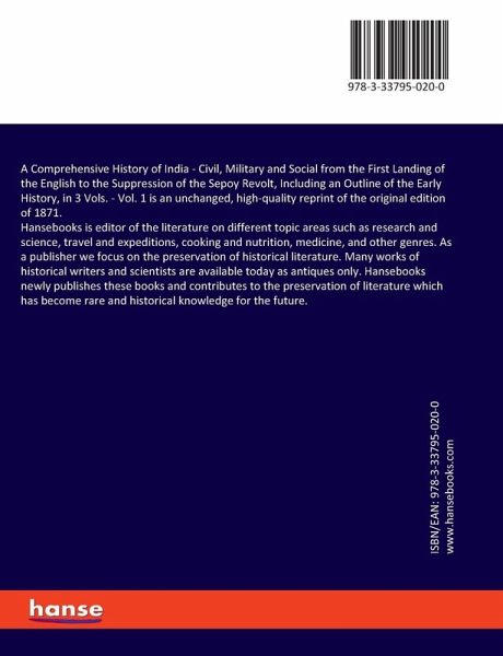A Comprehensive History of India - Civil, Military and Social from the First Landing of the English to the Suppression of the Sepoy Revolt, Including an Outline of the Early History, in 3 Vols. - Vol. 1 is an unchanged, high-quality reprint of the original edition of 1871.Hansebooks is editor of the literature on different topic areas such as research and science, travel and expeditions, cooking and nutrition, medicine, and other genres. As a publisher we focus on the preservation of historical literature. Many works of historical writers and scientists are available today as antiques only. Hansebooks newly publishes these books and contributes to the preservation of literature which has become rare and historical knowledge for the future.
