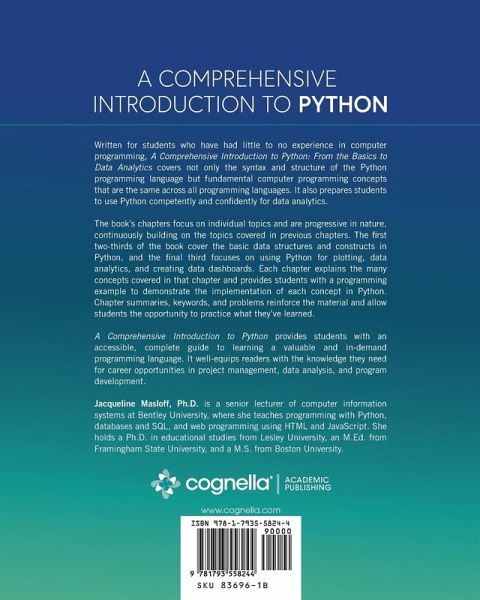 Written for students who have had little to no experience in computer programming, A Comprehensive Introduction to Python: From the Basics to Data Analytics covers not only the syntax and structure of the Python programming language but fundamental computer programming concepts that are the same across all programming languages. It also prepares students to use Python competently and confidently for data analytics. The book's chapters focus on individual topics and are progressive in nature, continuously building on the topics covered in previous chapters. The first two-thirds of the book covers the basic data structures and constructs in Python, and the final third focuses on using Python for plotting, data analytics, and creating data dashboards. Each chapter explains the many concepts covered in that chapter and provides students with a programming example to demonstrate the implementation of each co5ncept in Python. Chapter summaries, keywords, and problems reinforce the material and allow students the opportunity to practice what they've learned. A Comprehensive Introduction to Python provides students with an accessible, complete guide to learning a valuable and in-demand programming language. It well-equips readers with the knowledge they need for career opportunities in project management, data analysis, and program development.