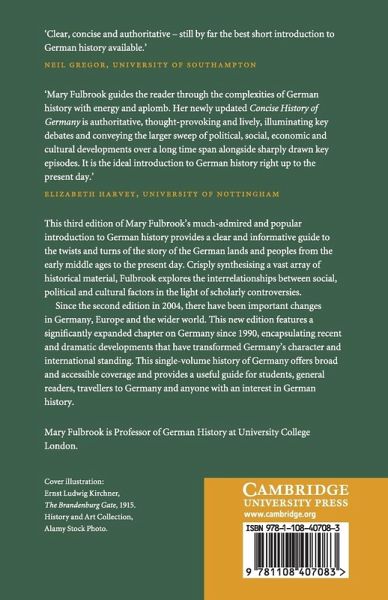 This third edition of Mary Fulbrook's much-admired and popular introduction to German history provides a clear and informative guide to the twists and turns of the story of the German lands and peoples from the early middle ages to the present day. Crisply synthesising a vast array of historical material, Fulbrook explores the interrelationships between social, political and cultural factors in the light of scholarly controversies. Since the second edition in 2004, there have been important changes in Germany, Europe and the wider world. This new edition features a significantly expanded chapter on Germany since 1990, encapsulating recent and dramatic developments that have transformed Germany's character and international standing. This single-volume history of Germany offers broad and accessible coverage and provides a useful guide for students, general readers, travellers to Germany and anyone with an interest in German history.