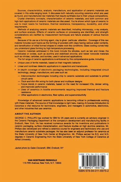 to Cera1l1ics by George C. Phillips ~ V AN NOSTRAND REINHOLD ~ ~ ____ New York Copyright (' 1991 by Van Nostrand Reinhold Softcover reprint of the hardcover 1 st edition 1991 Library of COnRreSS Catalog Card Number 91·19587 ISBN·13: 978·94·011--6975·2 All rights eserve r d. No part of this work covered by the copyright hereon may be rcproduccd or uscd in any form or by any means-graphic. electronic. or meehaniclli. including photocopying. recording. taping. or information storage and retrieval systems-without written permission of the publisher. Manufactured in the United States of America Published by Van Nostrand Reinhold 115 Fifth Avenue New York. New York 10003 Chapman and Ha ll 2-6 Boundary Row London. SEI SHN. England Thomas Nelson Australia 102 Dodds Street South Melbourne 3205 Victoria. Australia Nelson Canada 1120 Birchmounl Road Scarborough. Ontario M IK 5G4. Canada 16 15 14 13 12 II 10 9 8 7 6 5 4 3 2 Library or Congress Cataloging-in· Publication Data Phillips. GeorgeC .. 1937- A concise inlrodu!;tion to ceramics/by George C. Phillips. p. cm. Includes bibliographical referen!;es and index. ISBN-13: 978-94-011--6975-2 e-ISBN-13: 978-94-011--6973-8 001:10: 1007/978-94-011--6973-8 I. Cerami!;s. L Tille.
