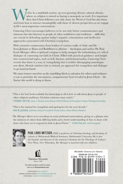 We live in a multifaith society: an ever-growing, diverse cultural climate, where no religion is viewed as having a monopoly on truth. It is important when that Christ-followers not only share the Word of God but also listen and learn how to interact meaningfully with those of diverse perspectives as we engage in life's most important conversations. Connecting Christ encourages believers to be not only better communicators and witnesses but also listeners to people of other worldviews and traditions--skills that are crucial in defending against today's negative connotations and ineffective approaches associated with Christian evangelism. With extensive commentary from leaders of various walks of faith and life -- from Judaism to Islam and Buddhism to atheism --theologian and author Dr. Paul Louis Metzger offers a spiritual compass to help navigate the intimidating yet critical dialogue of conveying our faith in Christ. Filled with practical guidance and insight into controversial topics, such as hell, fascism, and homosexuality, Connecting Christ reveals that there is a way of evangelizing that is neither disengaging monologue nor silent, lifestyle ministry but is, instead, an approach for evangelism and dialogue to go hand-in-hand. We must remove ourselves as the stumbling block to salvation for others and embrace a way to proclaim the uncommon, compassionate God revealed in Jesus Christ--the Savior this world is dying to know.