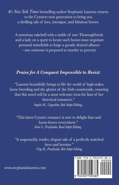 #1 New York Times bestselling author Stephanie Laurens returns to the Cynsters' next generation to bring you a thrilling tale of love, intrigue, and fabulous horses. A notorious rakehell with a stable of rare Thoroughbreds and a lady on a quest to locate such horses must negotiate personal minefields to forge a greatly desired alliance-one someone is prepared to murder to prevent. Prudence Cynster has turned her back on husband hunting in favor of horse hunting. As the head of the breeding program underpinning the success of the Cynster racing stables, she's on a quest to acquire the necessary horses to refresh the stable's breeding stock. On his estranged father's death, Deaglan Fitzgerald, now Earl of Glengarah, left London and the hedonistic life of a wealthy, wellborn rake and returned to Glengarah Castle determined to rectify the harm caused by his father's neglect. Driven by guilt that he hadn't been there to protect his people during the Great Famine, Deaglan holds firm against the lure of his father's extensive collection of horses and, leaving the stable to the care of his brother, Felix, devotes himself to returning the estate to prosperity. Deaglan had fallen out with his father and been exiled from Glengarah over his drive to have the horses pay their way. Knowing Deaglan's wishes and that restoration of the estate is almost complete, Felix writes to the premier Thoroughbred breeding program in the British Isles to test their interest in the Glengarah horses. On receiving a letter describing exactly the type of horses she's seeking, Pru overrides her family's reluctance and sets out for Ireland's west coast to visit the now-reclusive wicked Earl of Glengarah. Yet her only interest is in his horses, which she cannot wait to see. When Felix tells Deaglan that a P. H. Cynster is about to arrive to assess the horses with a view to a breeding arrangement, Deaglan can only be grateful. But then P. H. Cynster turns out to be a lady, one utterly unlike any other he's ever met. Yet they are who they are, and both understand their world. They battle their instincts and attempt to keep their interactions businesslike, but the sparks are incandescent and inevitably ignite a sexual blaze that consumes them both-and opens their eyes. But before they can find their way to their now-desired goal, first one accident, then another distracts them. Someone, it seems, doesn't want them to strike a deal. Who? Why? They need to find out before whoever it is resorts to the ultimate sanction. A historical romance with neo-Gothic overtones, set in the west of Ireland. A Cynster Next Generation novel-a full-length historical romance of 125,000 words. Praise for the works of Stephanie Laurens "Stephanie Laurens' heroines are marvelous tributes to Georgette Heyer: feisty and strong." Cathy Kelly "Stephanie Laurens never fails to entertain and charm her readers with vibrant plots, snappy dialogue, and unforgettable characters." Historical Romance Reviews. "Stephanie Laurens plays into readers' fantasies like a master and claims their hearts time and again." Romantic Times Magazine