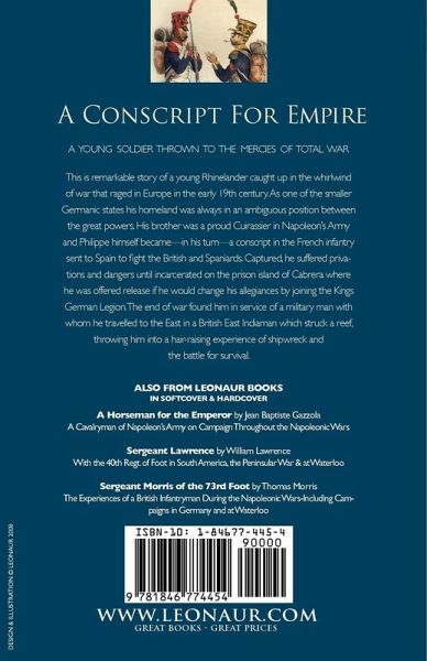 A young soldier thrown to the mercies of total war This is remarkable story of a young Rhinelander caught up in the whirlwind of war that raged in Europe in the early 19th century. As one of the smaller Germanic states his homeland was always in an ambiguous position between the great powers. His brother was a proud Cuirassier in Napoleon's Army and Philippe himself became-in his turn-a conscript in the French infantry sent to Spain to fight the British and Spaniards. Captured, he suffered privations and dangers until incarcerated on the prison island of Cabrera where he was offered release if he would change his allegiances by joining the Kings German Legion. The end of war found him in service of a military man with whom he travelled to the East in a British East Indiaman which struck a reef, throwing him into a hair-raising experience of shipwreck and the battle for survival.