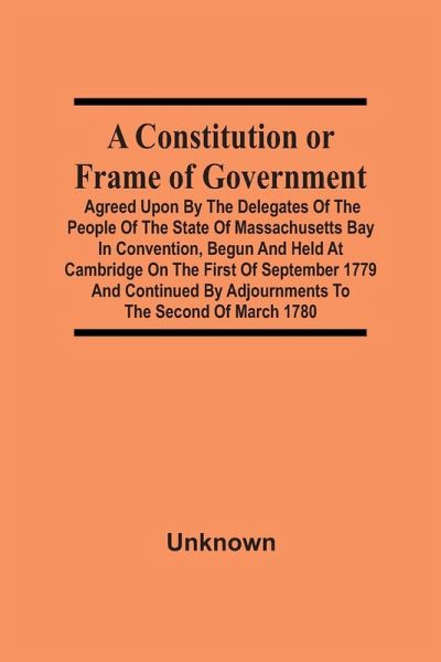 A Constitution Or Frame Of Government : Agreed Upon By The Delegates Of The People Of The State Of Massachusetts Bay In Convention, Begun And Held At Cambridge On The First Of September 1779 And Continued By Adjournments To The Second Of March 1780 has been considered by academicians and scholars of great significance and value to literature. This forms a part of the knowledge base for future generations. So that the book is never forgotten we have represented this book in a print format as the same form as it was originally first published. Hence any marks or annotations seen are left intentionally to preserve its true nature.…mehr