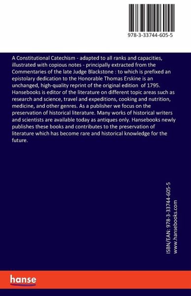 A Constitutional Catechism - adapted to all ranks and capacities, illustrated with copious notes - principally extracted from the Commentaries of the late Judge Blackstone : to which is prefixed an epistolary dedication to the Honorable Thomas Erskine is an unchanged, high-quality reprint of the original edition of 1795.Hansebooks is editor of the literature on different topic areas such as research and science, travel and expeditions, cooking and nutrition, medicine, and other genres. As a publisher we focus on the preservation of historical literature. Many works of historical writers and scientists are available today as antiques only. Hansebooks newly publishes these books and contributes to the preservation of literature which has become rare and historical knowledge for the future.