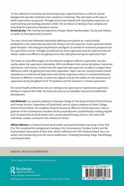 Foreword by Fred Busch Preface Introduction Acknowledgments Chapter 1: Defining Effective Supervision Through the Eyes of the Supervisee: A Contemporary Systematic Review Liat Shklarski and Allison Abrams Chapter 2: Effective Supervision During the Covid-19 Pandemic: The Transition to Remote Learning Liat Shklarski and Allison Abrams Chapter 3: Social Justice and Cultural Competence in Clinical Supervision Liat Shklarski and Allison Abrams Chapter 4: Effective Supervision Despite Cultural and Theoretical Differences Ruiqi Tian Chapter 5: Remote Supervision Between Korea and New York: Overcoming Cross-Cultural Challenges in Supervision Moosuk Lee Chapter 6: Embarking on the Journey of Psychoanalytic Supervision: The Supervisor as the Fixer Camille Maruccia-Lee Chapter 7: Psychodynamic Supervision in the Nonprofit Sector Ally Barlow Chapter 8: Navigating Differences in Disciplines and Theoretical Orientations Allison Abrams Chapter 9: Supervision with Barbara: Two Detectives Working on a Case Liat Shklarski Chapter 10: Supervision and The Termination Process Anonymous author Chapter 11: Supervisor: ¿A Daunting Privilege Barbara Stimmel Index