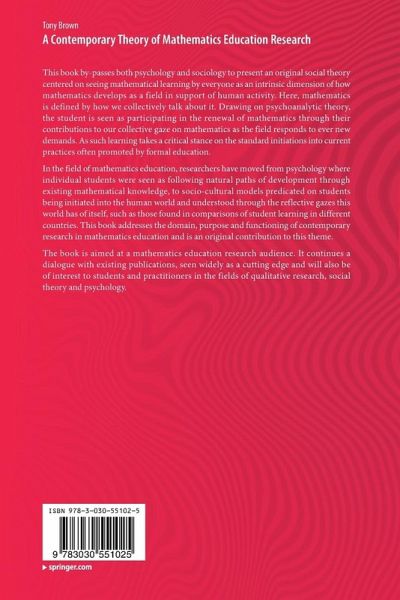 This book by-passes both psychology and sociology to present an original social theory centered on seeing mathematical learning by everyone as an intrinsic dimension of how mathematics develops as a field in support of human activity. Here, mathematics is defined by how we collectively talk about it. Drawing on psychoanalytic theory, the student is seen as participating in the renewal of mathematics through their contributions to our collective gaze on mathematics as the field responds to ever new demands. As such learning takes a critical stance on the standard initiations into current practices often promoted by formal education.