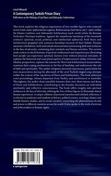 This book explores the religious experiences of two notable figures who endured severe trials under authoritarian regimes: Bediuzzaman Said Nursi (1877-1960) within the Islamic tradition, and Aleksander Solzhenitsyn (1918-2008) within the Russian Orthodox Christian tradition. Against the tumultuous backdrop of the twentieth century's spiritual, social, political, and intellectual upheavals, both Nursi and Solzhenitsyn grappled with immense hardships because of their beliefs. Despite immense tribulations, both individuals demonstrated unwavering faith and resilience in the face of adversity, continuing their scholarly and literary activities. The current study centers on the dichotomy of spiritual confinement and expansiveness, illustrating how people can experience spiritual distress even without physical restraints. It explores the historical and conceptual aspects of imprisonment within Christian and Muslim perspectives, explores the reasons for Nursi and Solzhenitsyn's incarceration, examines their coping mechanisms in the face of hardship, and underscores the role of faith and spirituality. The author integrates personal experiences, particularly his own incarceration during the aftermath of the 2016 Turkish staged coup attempt, within the context of the narratives of Nursi and Solzhenitsyn. The book addresses court proceedings, release, departure from Turkey, and resettlement in Australia. Throughout, the author draws parallels between their own observations and those of Nursi and Solzhenitsyn, contributing to the broader discourse on individual spirituality and collective consciousness. The book offers insights into spiritual resilience in the face of adversity, utilizing the lives of these figures to illuminate shared human experiences. A unique collation of personal narration and scholarly reflection, it is relevant to academics and students in history, political science, sociology, Islamic and Middle Eastern studies, and to social scientists researchingthe phenomenon of exile and prison in different countries across the world. It also speaks to the work of activists and policymakers in human rights.