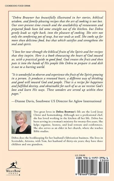 "Debra Brawner has beautifully illustrated in her stories, biblical wisdom, and family-pleasing recipes that the art of cooking is not lost. Our ever-present time crunch and the availability of restaurants and prepared foods have led some straight out of the kitchen, but Debra gently leads us right back, into the pleasure of cooking. She stirs not only the comforting pot of soup, but our souls as well. She cooks up far more than delicious food, but that which satisfies and strengthens the soul and spirit. "I love her tour through the biblical fruits of the Spirit and her recipes that they inspire. Here is a book showcasing the heart of God toward us, with a practical guide to good food. God creates the fruit and then puts it into the hands of His people like Debra to prepare it and dish it out to a hurting world. "It is wonderful to observe and experience the fruit of the Spirit growing in a person. It produces a renewed heart, a different way of thinking and good will toward God and people. That is a recipe for happiness and fulfilled destiny, and obtainable for each of us as we receive God's love and learn His ways. These wonders are served up within these pages." -Dianne Davis, Southwest US Director for Aglow International