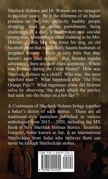Sherlock Holmes and Dr. Watson are no strangers to peculiar cases. Be it the dilemma of an Indian princess on the run, perfectly healthy people dropping dead as divine punishment, being challenged to a duel, a heartbroken and suicidal young man, a beautiful woman claiming to be Mrs. Holmes, a little boy who loves his dog, an old Scottish ghost that traditionally haunts husbands of pregnant women - there is very little they haven't seen (and solved). But, besides regular adventures, there are quite a few questions - Where was Holmes during the Great Hiatus? How was Sherlock Holmes as a child? Who was 'the most repellent man'? What happened after 'The Five Orange Pips'? What ingenious crime did Holmes solve by observing 'the depth which the parsley had sunk into the butter upon a hot day'? A Continuum of Sherlock Holmes brings together a baker's dozen of such stories. These are all traditional-style pastiches published in various anthologies from 2015 - 2020, including the MX Book of New Sherlock Holmes Stories. Jayantika Ganguly, better known as Jay, is an international Sherlockian from India who believes there can never be enough Sherlockian stories.
