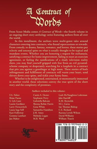 From Scout Media comes A Contract of Words—the fourth volume in an ongoing short story anthology series featuring authors from all over the world. In this installment, the authors wove multi-genre tales around characters entering into contracts, who found repercussions or rewards. From comedy, to drama, fantasy, romance, and horror, these stories put eclectic and unusual spins on what is usually thought to be typical and mundane events. Whether you are honoring a request for euthanasia, satisfying a contract for home improvement, failing to meet an exorcism agreement, or feeling the ramifications of a shady television reality show, you may find yourself gripped with fear from an evil pyramid-scheme company or desperately searching for a loophole in a contract that pits you against a gunslinger at high noon. These stories of both infringement and fulfillment of contracts will warm your heart, send shivers down your spine, and tickle your funny bone. Whether to be enlightened, entertained, or momentarily immersed in another world, these selections convey the true spirit of the short story and the complexity of promises.