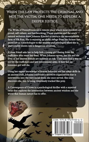 When the law protects the criminal and not the victim, one needs to explore a deeper justice. Retired psychologist Johanna Kincaid thought she'd found a refuge from her fast-paced life in the remote Wilds of Pennsylvania. But when she agrees to help a victim of a horrific crime, her peaceful life is thrown into peril. She joins a fierce band of women with the necessary skills to combat layers of secrecy and privilege. Together they are determined to take down a secretive organization that has infiltrated the very society Johanna once served. If they fail, an innocent girl will pay the ultimate price. Drawn into a dangerous game, she must pit her expert knowledge of human behavior and unique skills in an ancient craft against sex traffickers and law enforcement, alike. As the stakes get higher and the risks intensify, Johanna realizes she, too, is being hunted like prey. A Convergence of Crows is a gripping, psychic thriller that will have you on the edge of your seat. With shocking revelations, heart-pounding danger, and a splash of supernatural, this book will captivate fans of William Kent Krueger and Anne Hillerman. Don't miss out on the first installment of the Johanna Kincaid Mystery Series.