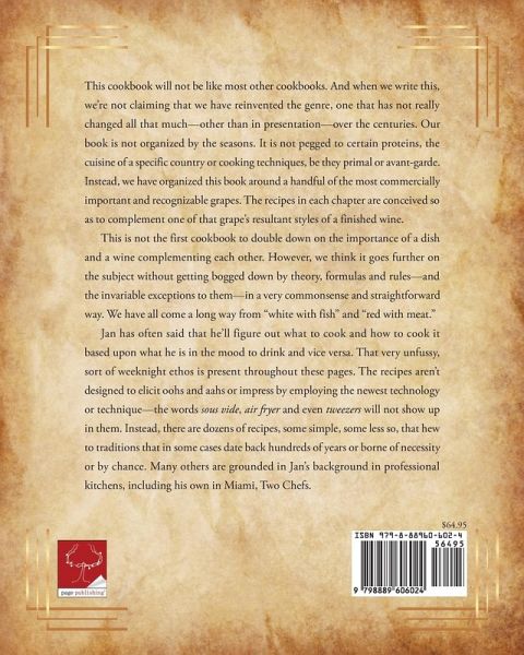 This cookbook will not be like most other cookbooks. And when we write this, we're not claiming that we have reinvented the genre, one that has not really changed all that much--other than in presentation--over the centuries. Our book is not organized by the seasons. It is not pegged to certain proteins, the cuisine of a specific country or cooking techniques, be they primal or avant-garde. Instead, we have organized this book around a handful of the most commercially important and recognizable grapes. The recipes in each chapter are conceived so as to complement one of that grape's resultant styles of a finished wine. This is not the first cookbook to double down on the importance of a dish and a wine complementing each other. However, we think it goes further on the subject without getting bogged down by theory, formulas and rules--and the invariable exceptions to them--in a very commonsense and straightforward way. We have all come a long way from "white with fish" and "red with meat." Jan has often said that he'll figure out what to cook and how to cook it based upon what he is in the mood to drink and vice versa. That very unfussy, sort of weeknight ethos is present throughout these pages. The recipes aren't designed to elicit oohs and aahs or impress by employing the newest technology or technique--the words sous vide, air fryer and even tweezers will not show up in them. Instead, there are dozens of recipes, some simple, some less so, that hew to traditions that in some cases date back hundreds of years or borne of necessity or by chance. Many others are grounded in Jan's background in professional kitchens, including his own in Miami, Two Chefs.