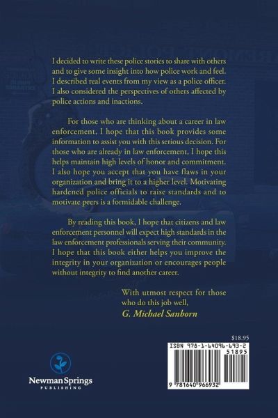 I decided to write these police stories to share with others and to give some insight into how police work and feel. I described real events from my view as a police officer. I also considered the perspectives of others affected by police actions and inactions. For those who are thinking about a career in law enforcement, I hope that this book provides some information to assist you with this serious decision. For those who are already in law enforcement, I hope this helps maintain high levels of honor and commitment. I also hope you accept that you have flaws in your organization and bring it to a higher level. Motivating hardened police officials to raise standards and to motivate peers is a formidable challenge. By reading this book, I hope that citizens and law enforcement personnel will expect high standards in the law enforcement professionals serving their community. I hope that this book either helps you improve the integrity in your organization or encourages people without integrity to find another career. With utmost respect for those who do this job well, G. Michael Sanborn