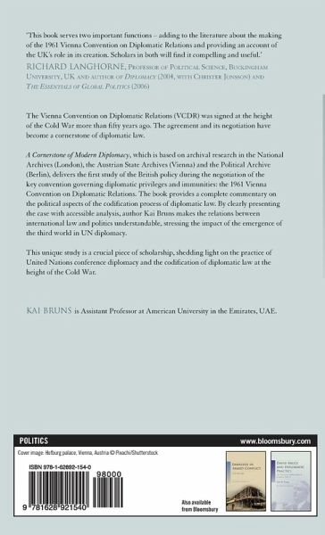 The Vienna Convention on Diplomatic Relations (VCDR) was signed at the height of the Cold War more than fifty years ago. The agreement and its negotiation have become a cornerstone of diplomatic law. A Cornerstone of Modern Diplomacy, which is based on archival research in the National Archives (London), the Austrian State Archives (Vienna) and the Political Archive (Berlin), delivers the first study of the British policy during the negotiation of the key convention governing diplomatic privileges and immunities: the 1961 Vienna Convention on Diplomatic Relations. The book provides a complete commentary on the political aspects of the codification process of diplomatic law. By clearly presenting the case with accessible analysis, author Kai Bruns makes the relations between international law and politics understandable, stressing the impact of the emergence of the third world in UN diplomacy. This unique study is a crucial piece of scholarship, shedding light on the practice of United Nations conference diplomacy and the codification of diplomatic law at the height of the Cold War.