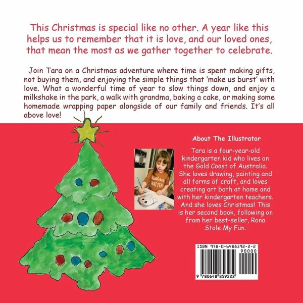 What a year 2020 has been! And what a super special Christmas this Christmas will be. This beautifully illustrated children's book follows on from Rona Stole My Fun (a best-seller), and tells of the excitement of a child in the build up to Christmas. Illustrated by a four-year-old kindergarten girl, Tara, the book celebrates her love of making gifts and craft for people at Christmas and would be a brilliant tool for kindergarten teachers, childcare workers, juvenile educators, and parents and grandparents looking to reinforce the non-commercial aspects of Christmas. The love, the family time, the making of gifts, the hugs, the family roast, and the singing all form a key element in this children's story. It is not all about the toys! This 36-page book celebrates everything that is special about Christmas, especially now that a pandemic has shown us what really matters most in our lives. It shows us that love matters, family matters, and time matters. It shows us that it is the thought that truly counts at Christmas. It encourages children to think about all the people who love and care for them. It encourages children to reflect on the simple things in life. And hopefully it encourages children to think about what they have the power to create in their own artistic way! A book for every kindergarten, early education teacher, parent, carer and grandparent. The book is dedicated to C&K Community Kindergarten, Oxenford, QLD, Australia, where Tara currently attends. It includes a lovely piece on pages 34 and 35 written by Tara and her mummy dedicated to any child scared of starting kindergarten. This piece will be very useful for parents and carers in helping allay any fears your child may have and highlighting the benefits of kindy!