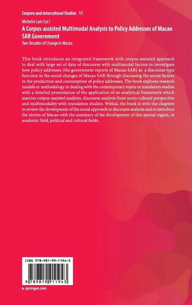 This book introduces an integrated framework with corpus-assisted approach to deal with large set of data of discourse with multimodal factors to investigate how policy addresses (the government reports of Macao SAR) as a discourse type function in the social changes of Macao SAR through discussing the social factors to the production and consumption of policy addresses. The book explores research models or methodology in dealing with the contemporary topics in translation studies with a detailed presentation of the application of an analytical framework which marries corpus-assisted analysis, discourse analysis from socio-cultural perspective and multimodality with translation studies. Withal, the book is with the chapters to review the development of the social approach to discourse analysis and to introduce the stories of Macao with the summary of the development of this special region, in academic field, political and cultural fields.