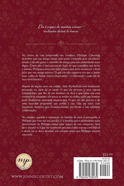 Ela é capaz de muitas coisas - inclusive deixá-lo louco. No início de sua temporada em Londres, Philippa Clavering descobre que sua amiga Susan está sendo cortejada pelo cavalheiro errado e decide guiar o caminho da amiga para um pretendente mais digno. Como não é uma pessoa de fugir do que considera seu dever e talento, Philippa coloca em ação planos para fazer acontecer o final feliz que sua amiga merece. O que ela não esperava era que o irmão mais velho de Susan estava observando - e criticando - cada um de seus movimentos. Depois de alguns anos na cidade, Jack Blythefield está finalmente pensando na ideia de se casar. O que ele procura é uma esposa complacente, que lhe dê um herdeiro ou dois e que torne sua casa confortável, enquanto ele passa as noites no clube, onde um homem pode finalmente encontrar alguma paz. O que ele não precisa é de uma mocinha prepotente que ponha a sua vida em risco com esquemas malucos que invariavelmente envolvam a sua relutante colaboração. No entanto, quando a reputação da família de Jack é ameaçada, é Philippa que vem em seu auxílio. E à medida que o pretendente mais determinado de Philippa pensa estar seguro de sua conquista, Jack deve decidir se o que ele realmente procura é uma esposa confortável e dócil, ou se deve desafiar seu coração antes que Philippa encerre sua corte.
