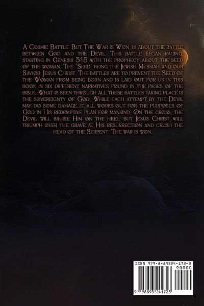 A Cosmic Battle: But The War is Won, is about the battle between God and the Devil. This battle began raging, starting in Genesis 3:15 with the prophecy about the seed of the woman. The "Seed" being the Jewish Messiah and our Savior, Jesus Christ. The battles are to prevent the Seed of the Woman from being born and is laid out for us in this book in six different narratives found in the pages of the bible. What is seen through all these battles taking place is the sovereignty of God. While each attempt by the Devil may do some damage, it all works out for the purposes of God in His redemptive plan for mankind. On the cross, the Devil will bruise Him on the heel, but Jesus Christ will triumph over the grave at His resurrection and crush the head of the Serpent. The war is won.