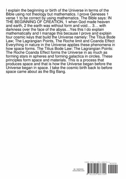 I explain Genesis 1 v 1, the beginning or birth of the Universe in terms of the Bible using not theology but mathematics. I prove Genesis 1 verse 1 to be correct by using mathematics. The Bible says: IN THE BEGINNING OF CREATION, 1 when God made heaven and earth, 2 the earth was without form and void... 3... with darkness over the face of the abyss...Yes this I do explain mathematically and I manage this because I prove and explain four cosmic keys that build the Universe namely: The Titius Bode Law; The Lagrangian Points, The Roche limit and Coanda Effect Everything in nature in the Universe applies these phenomena in how space forms. The Titius Bode Law: The Lagrangian Points: The Roche Coanda Effect forms the Universe in as much as forming stars in spheres and forming galactica in circles. These principles form space and materials. This is a process that produces space and that is how the Universe began before the Universe began in space. I take the cosmic birth back to before space came about as the Big Bang.