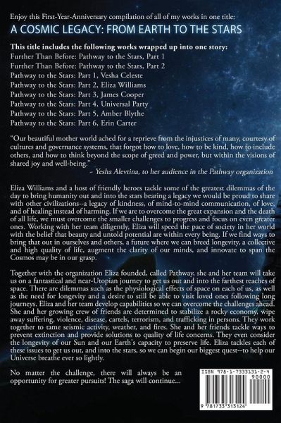 Enjoy First-Year-Anniversary compilation A Cosmic Legacy: From Earth to the Stars This title includes the following books in the Pathway to the Stars series: Part 1, Vesha Celeste Part 2, Eliza Williams Part 3, James Cooper Part 4, Universal Party Part 5, Amber Blythe Part 6, Erin Carter Part 7, Span of Influence Part 8, Dreamy & Deep Part 9, Allure & Spacecraft Part 10, Sky Taylor Part 11, A New Day Part 12, Alpha Andromedae "Our beautiful mother world ached for a reprieve from the injustices of many, courtesy of cultures and governance systems, that forgot how to love, how to be kind, how to include others, and how to think beyond the scope of greed and power, but within the visions of shared joy and well-being." ~ Yesha Alevtina to her audience in the Pathway organization Eliza Williams and a host of friendly heroes tackle dilemmas of the day to bring humanity to the stars bearing a legacy we would be proud to share with other civilizations--a legacy of kindness, mind-to-mind communication, love, and healing instead of harming. If we are to overcome what scientists call "the great expansion," and with it the death of all life, we must overcome the smaller challenges and focus on even greater ones. Working with her team diligently, Eliza will speed the pace of society in her world with the belief that beauty and untold potential are within every being. If we find ways to bring that out in ourselves and others, a future where we can breed longevity, a collective and high quality of life, and augment the clarity of our minds, as well as innovate to span the Cosmos may be in our grasp. Together with the organization Eliza Williams founded, called Pathway, she and her growing team take us on fantastical and Utopian journeys to get us out and into the farthest reaches of space. There are dilemmas such as the physiological effects of space on each of us, as well as the need for longevity and a desire to still be able to visit loved ones following long travels. Eliza and her team develop capabilities that allow us to overcome the challenges ahead. They are determined to stabilize a rocky economy, wipe away suffering, violence, disease, cartel activities, terrorism, and trafficking in persons. They work together to tame seismic activity, weather, fires, and more. She and her friends tackle ways to prevent extinction and provide solutions to quality of life concerns. They even consider the longevity of our Sun and our Earth's capacity to preserve life. Eliza tackles each of these issues to get us out, and into the stars, so we can begin our biggest quest--to help our Universe breathe ever so lightly. No matter the challenge, there will always be greater pursuits! The saga will continue...
